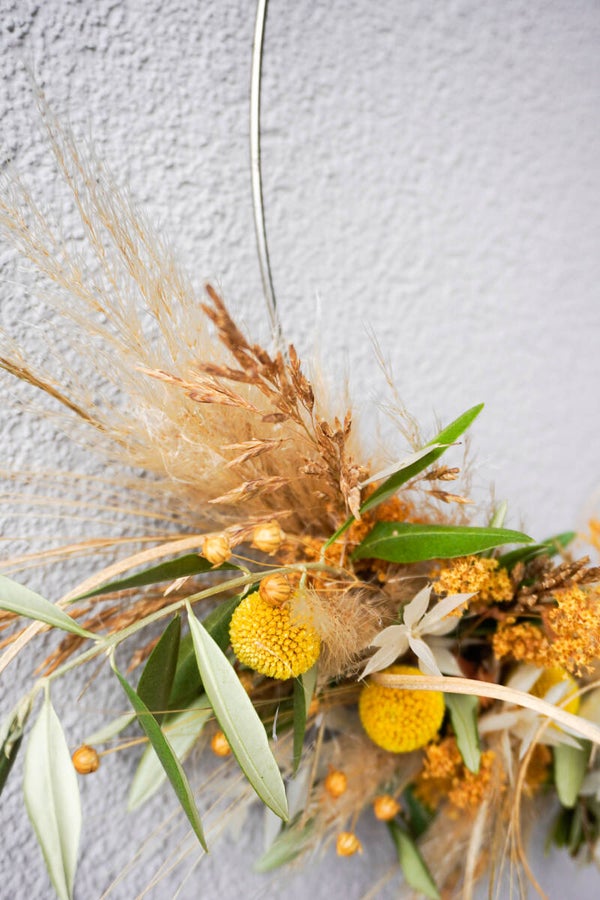 Dieser Kranz besticht durch eine wunderbare Kombination aus verschiedenen Gräsern, luftigem Pampasgras, leuchtend gelben Craspedia und kontrastreich grünem Olivenzweig. Ergänzt wird das Arrangement durch viele weitere Trockenblumen, die das Gesamtbild harmonisch abrunden. Ein wahrer Hingucker, der sowohl im Innenraum als auch an der Haustür für stilvolle Akzente sorgt.