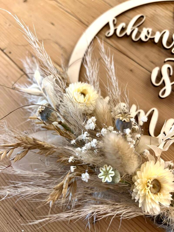 Ein stilvoller Holzkranz mit dem Spruch „Der schönste Weg ist der gemeinsame“, verziert mit Trockenblumen in einer schlichten Beige-Weiß-Kombination. Dieses zeitlose Design macht den Kranz zu einem wundervollen Geschenk zur Hochzeit, das die gemeinsame Reise des Paares symbolisiert.