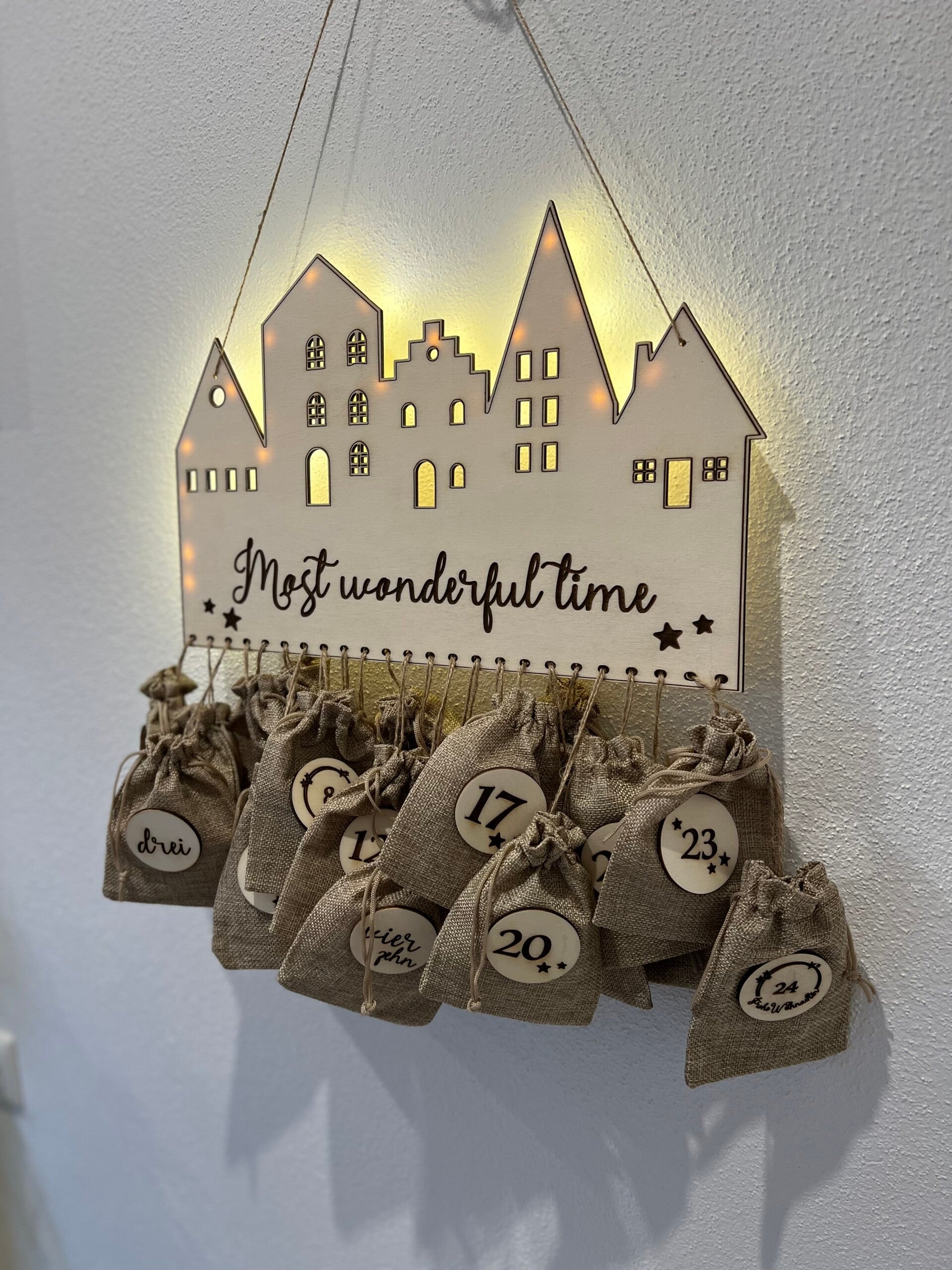 Der Adventskalender im modernen Lichterhaus-Look ist ein echter Hingucker! Er kann personalisiert oder mit der Aufschrift "Most Wonderful Time" gestaltet werden. Mit einer optionalen Lichterkette schafft er eine besinnliche Atmosphäre. Dank des Baukastensystems kannst du dir deinen individuellen Adventskalender ganz nach deinem Geschmack zusammenstellen!