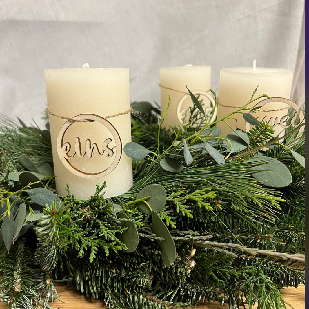 Die schlichten weißen Kerzen können auf Wunsch mit Holzzahlen verziert werden, um den Advent noch festlicher zu gestalten.