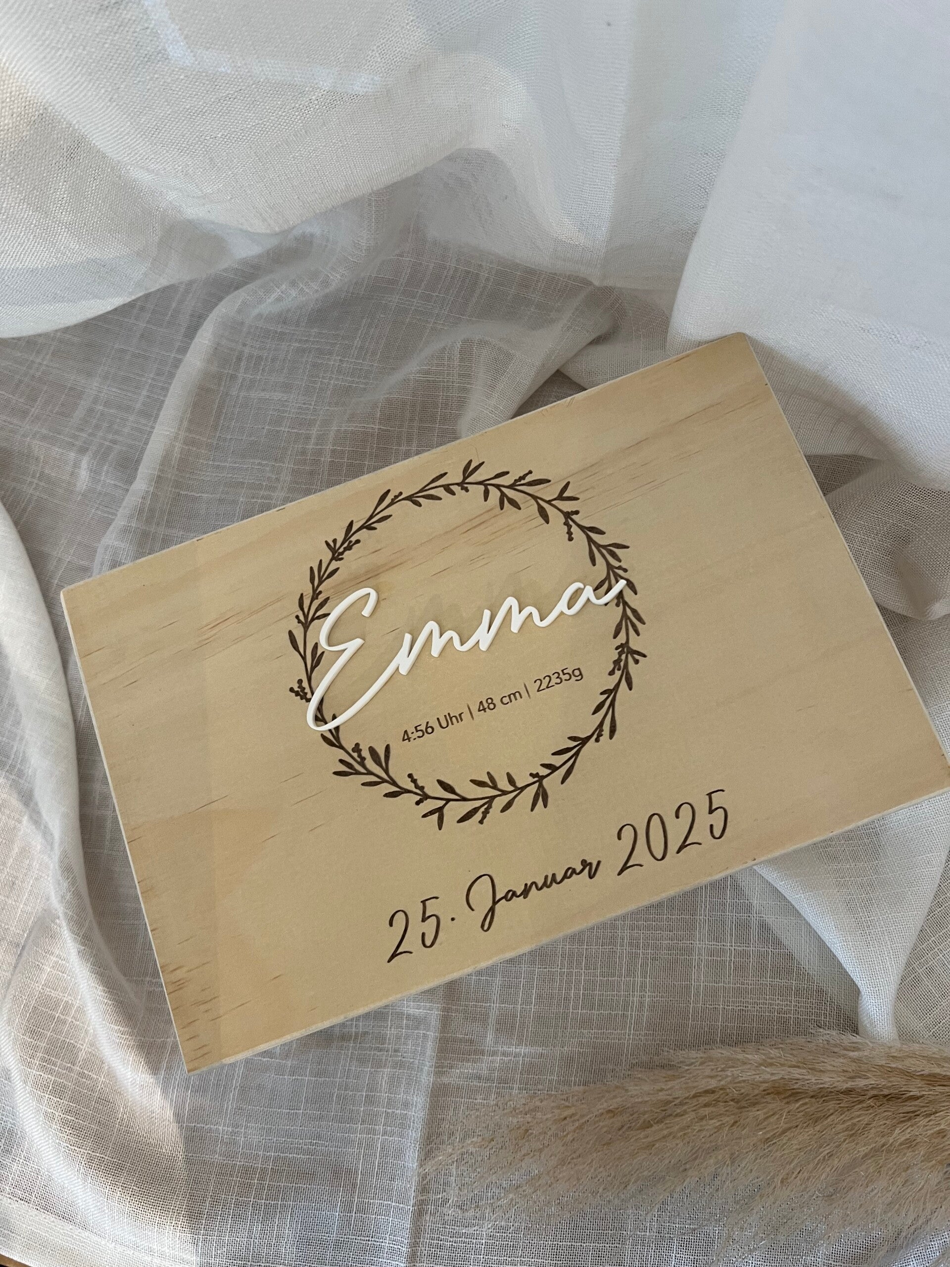 Bewahren Sie die wertvollsten Momente aus der Kindheit stilvoll auf. Das klassische Design "Emma" überzeugt mit seiner Schlichtheit. Die Kiste wird mittels eines Lasers graviert & erhält so ihren natürlichen & zeitlosen Look. Der Name wird durch weißes Acryl zum wahren Hingucker.